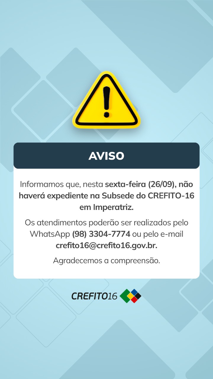 CREFITO-16 Informa: Subsede Imperatriz fechada nesta sexta-feira (26)
