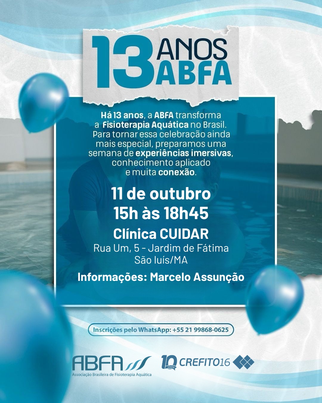 Há 13 anos, a ABFA transforma a Fisioterapia Aquática no Brasil. Para tornar essa celebração ainda mais especial, preparamos uma semana de experiências imersivas, conhecimento aplicado e muita conexão, acontecendo em várias cidades do Brasil.
