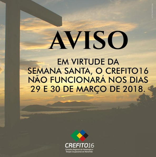 Nos dias 29 e 30 de março, o CREFITO-16 não terá expediente, por conta do feriado da Semana Santa, que antecede a Páscoa. As atividades do Conselho serão retomadas no dia 2 de abril.