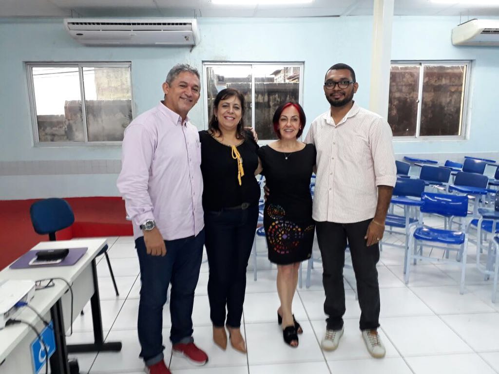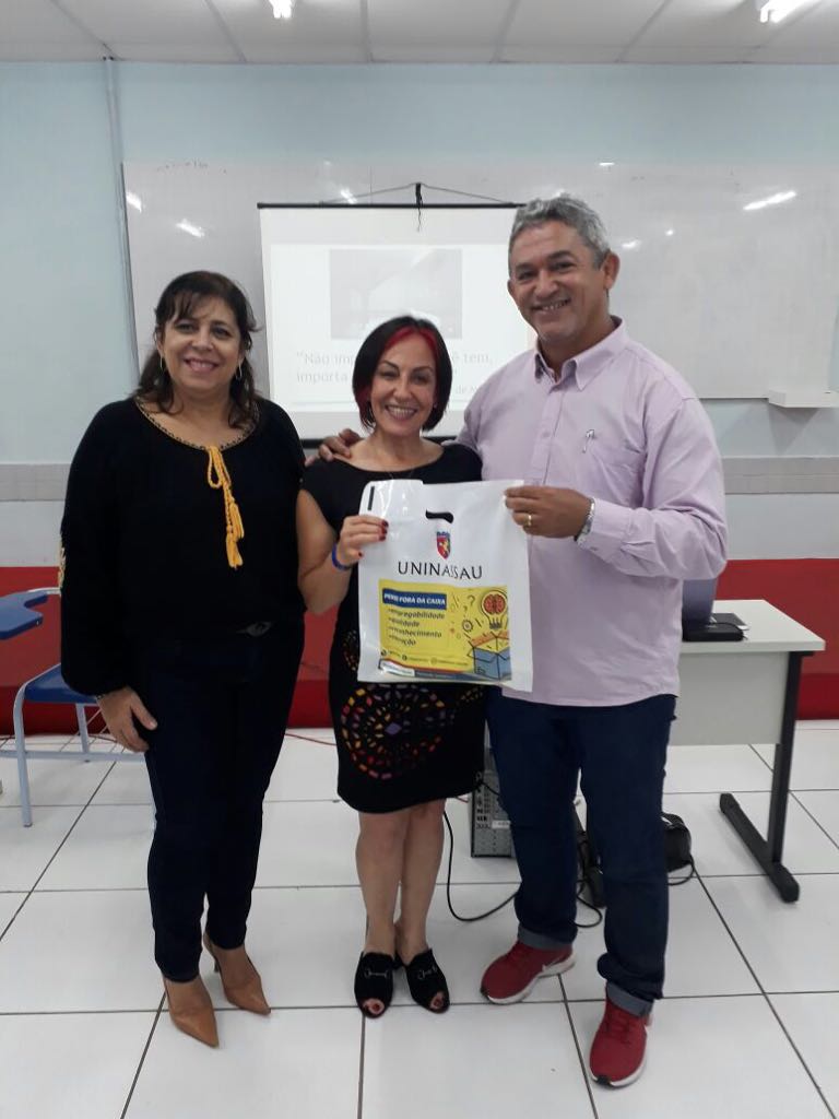 Dra. Elaine Markondes, durante conversa com alunos e com o coordenador do curso de Fisioterapia da Faculdade Maurício de Nassau, Dr. Alcione Nobre.