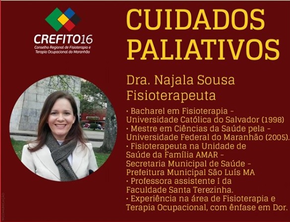 No próximo sábado (26), o CREFITO-16 vai promover mais uma edição do Café com Saber. Desta vez, o tema tratado será “Cuidados Paliativos”, a ser ministrado pela fisioterapeuta, Dra. Najala Sousa, e pela Terapeuta Ocupacional, Dra. Louise Costa. A palestra vai ocorrer às 9h, no auditório do Executive Lake Center.