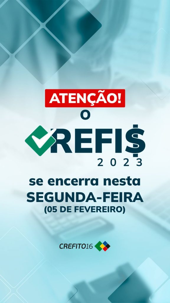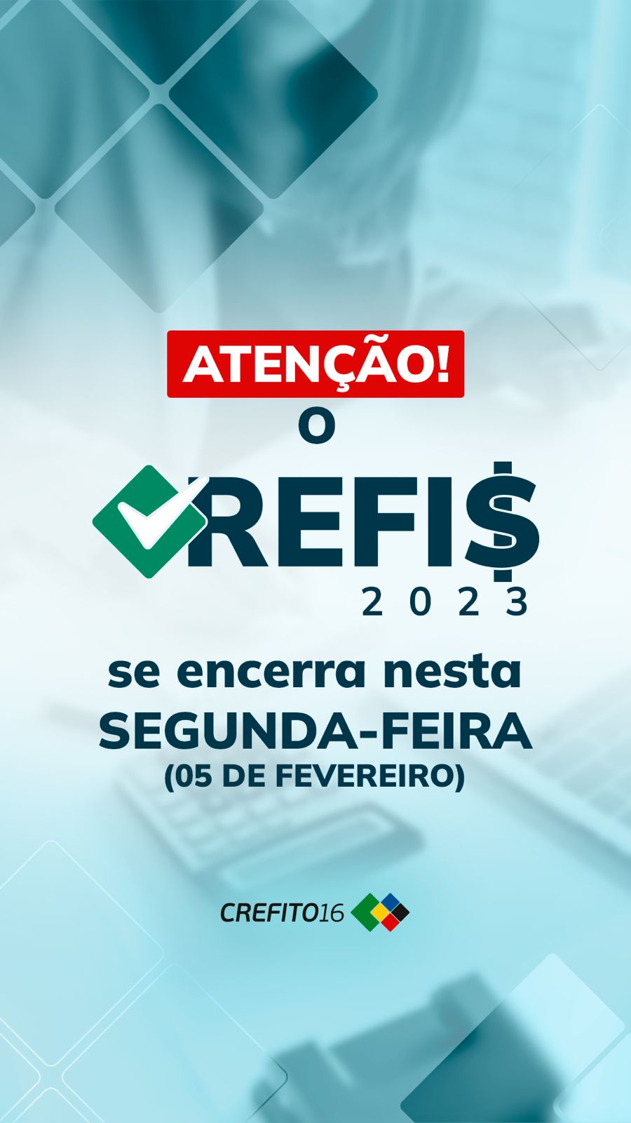 ⏳ O REFIS está chegando ao fim! 📅 Você tem até segunda-feira, 05 de fevereiro, para aproveitar essa oportunidade única de regularizar sua situação. Não deixe para depois, negocie suas dívidas agora e conte com condições especiais. Entre em contato pelo Telefone/WhatsApp (98) 3304-7774 ou pelo e-mail crefito16@crefito16.gov.br e saiba mais!