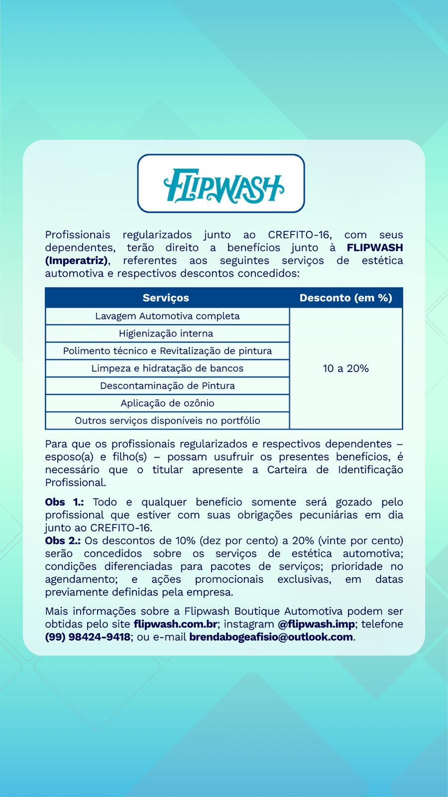 🚗✨ Profissionais regularizados junto ao CREFITO-16, assim como seus dependentes (cônjuge e filhos), agora contam com benefícios exclusivos na FLIPWASH Boutique Automotiva, em Imperatriz.