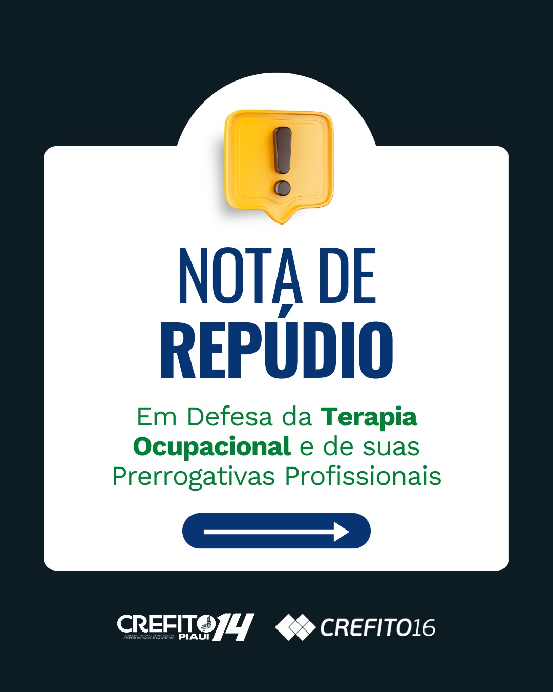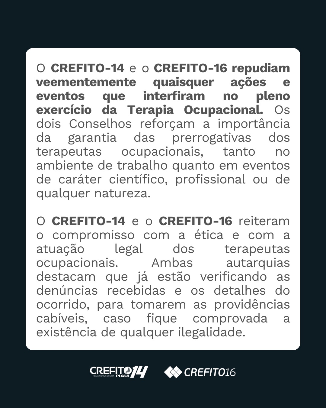O CREFITO-14 e o CREFITO-16 repudiam veementemente quaisquer ações e eventos que interfiram no pleno exercício da Terapia Ocupacional. Os dois Conselhos reforçam a importância da garantia das prerrogativas dos terapeutas ocupacionais, tanto no ambiente de trabalho quanto em eventos de caráter científico, profissional ou de qualquer natureza.