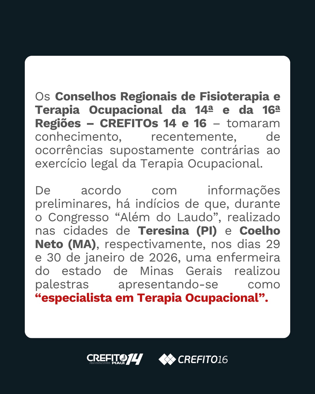 De acordo com informações preliminares, há indícios de que, durante o Congresso “Além do Laudo”, ocorrido nas cidades de Teresina (PI) e Coelho Neto (MA), respectivamente, nos dias 29 e 30 de janeiro de 2026, uma enfermeira do estado de Minas Gerais realizou palestras apresentando-se como “especialista em Terapia Ocupacional”.