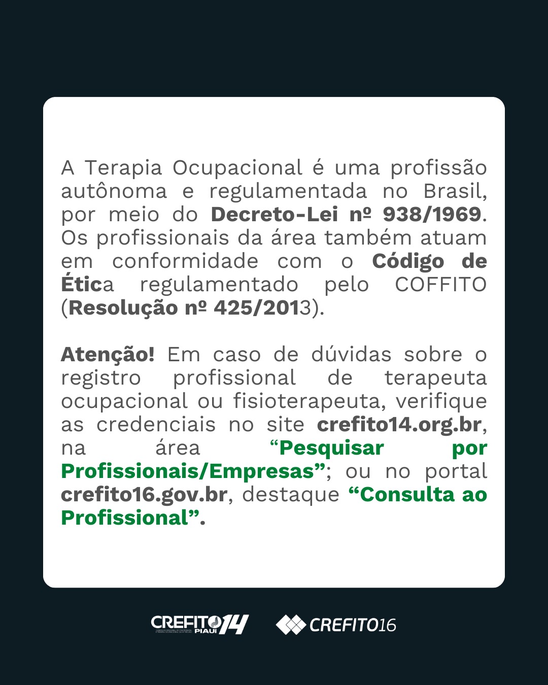 Atenção! Em caso de dúvidas sobre o registro profissional de terapeuta ocupacional ou fisioterapeuta, verifique as credenciais no site crefito14.org.br, na área “Pesquisar por Profissionais/Empresas”; ou no portal crefito16.gov.br, destaque “Consulta ao Profissional”.