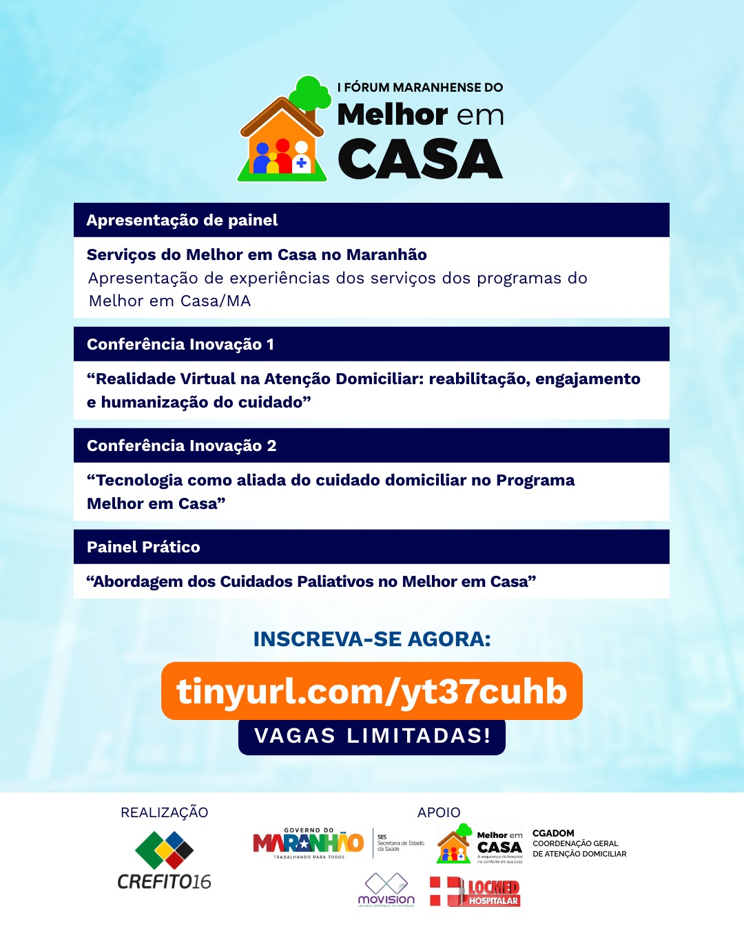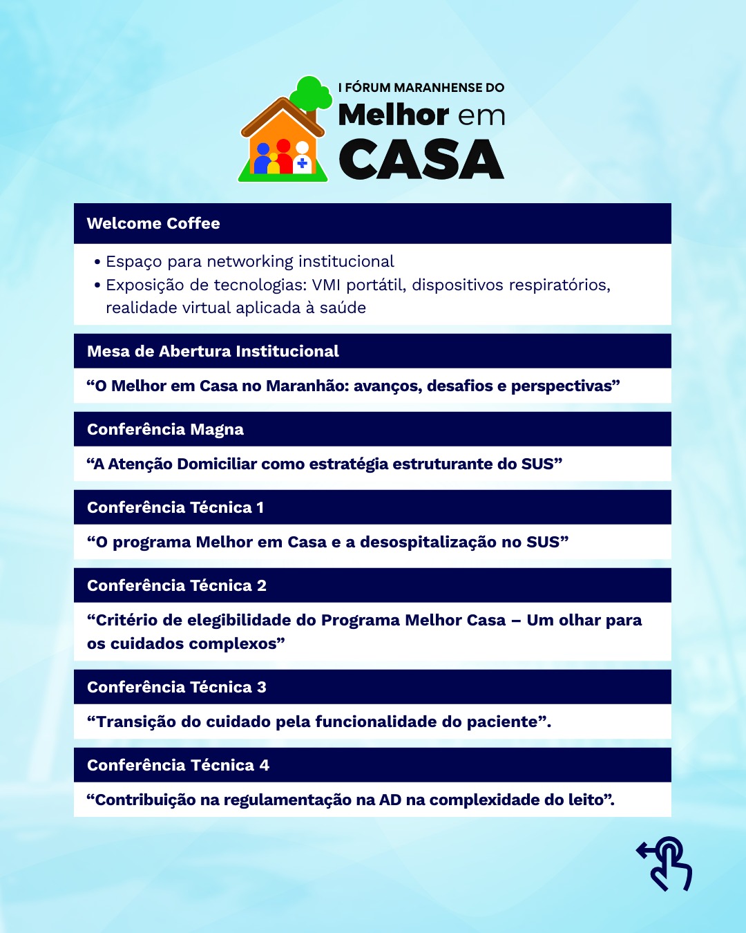 O evento é direcionado a fisioterapeutas, terapeutas ocupacionais e demais profissionais da saúde que atuam no Programa Melhor em Casa, com uma programação especial que inclui palestras, workshops e a Mostra de Experiências Exitosas do Programa no Maranhão.