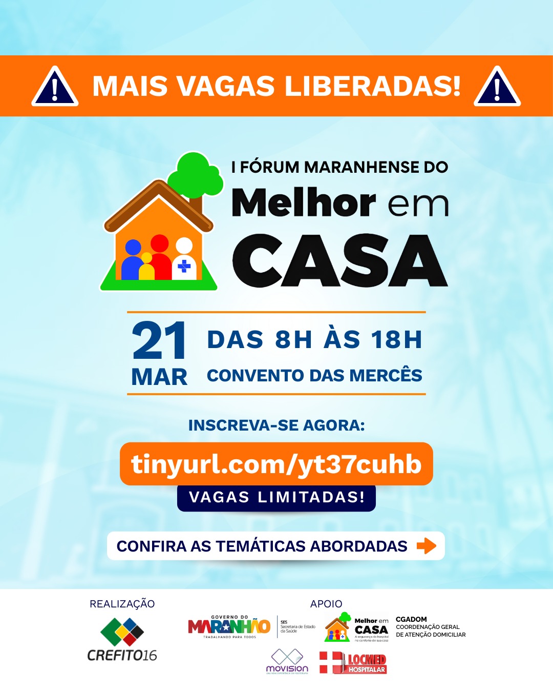 🚨 ATENÇÃO: MAIS VAGAS DISPONÍVEIS! Devido à grande procura, abrimos novas vagas para o I Fórum Maranhense do Programa Melhor em Casa!