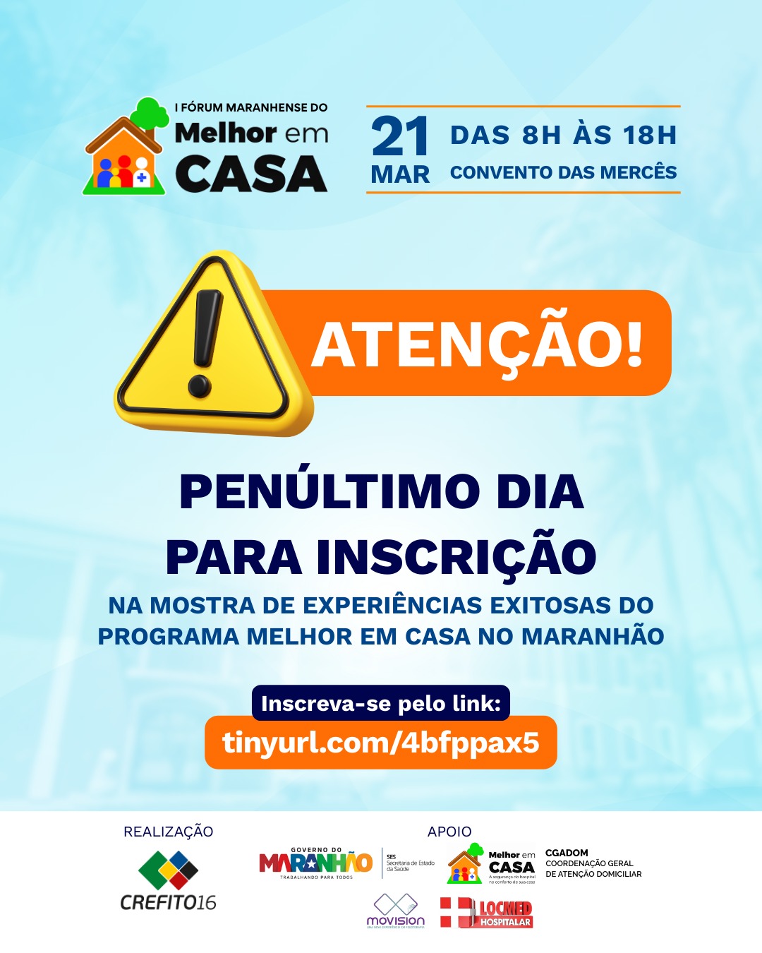 🚨 ATENÇÃO! Se você atua no Programa Melhor em Casa no Estado do Maranhão e desenvolve práticas que fazem a diferença no cuidado aos pacientes, essa é a oportunidade de compartilhar sua experiência, valorizar o trabalho das equipes e fortalecer o programa no nosso estado. 🏠💙