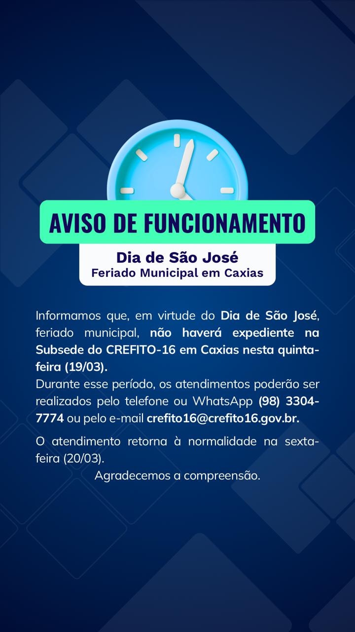 Aviso CREFITO-16: Feriado Municipal em Caxias nesta quinta-feira (19)