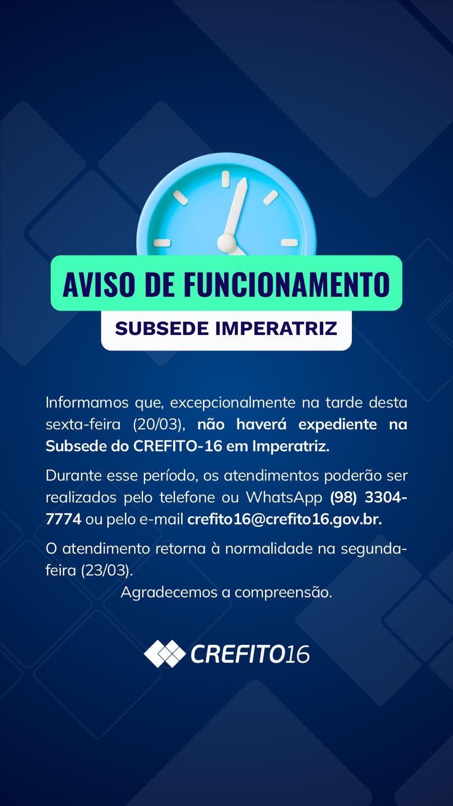Aviso CREFITO-16: Subsede Imperatriz fechada na tarde desta sexta-feira (20)