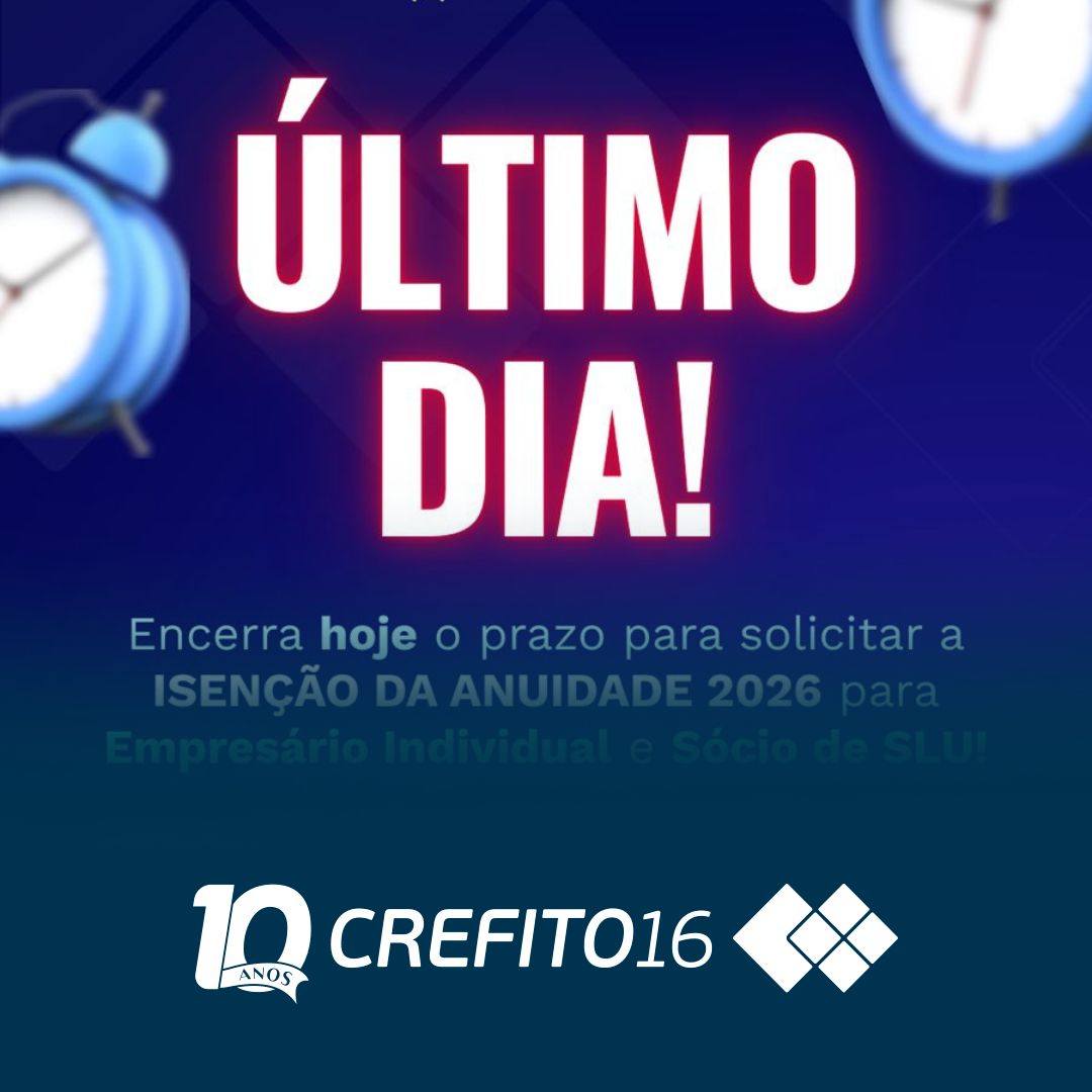 19 de janeiro de 2026 Falta 1 dia para o fim do prazo de solicitação de isenção da Anuidade 2026! compartilhar link - Continue reading »